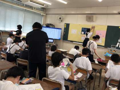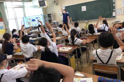元気いいっぱいに手を挙げる4年生の子どもたちです。