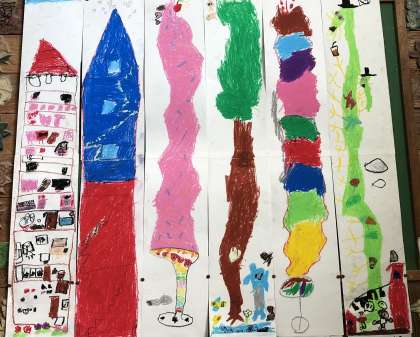 画用紙と画用紙をつなぎ合わせて、思い思いに