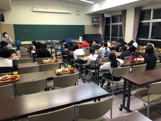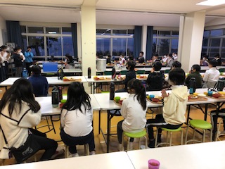 向かい合わせではなく、みんなが琵琶湖を見ながらの食事です。今回は、3組が会議室で食事をとります。