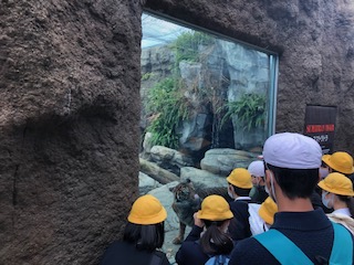 動物王国内は班行動です。お昼ご飯も班で時間を決めてとります。足もとに動物がいます。