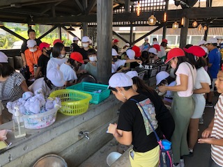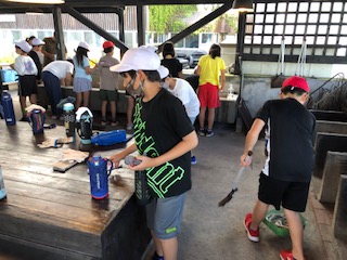食事の後片付けです。真っ黒になったお鍋もきれいにします。かまどの掃除もします。