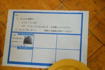 大阪市都市整備局の方にお越しいただいて校区内の「おもしろい」「めずらしい」「えっ」と思う建物を探しに行きました。探した後はみんなで発表会をしました。