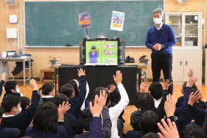 警察OBの方に来ていただきました。万引きについての紙芝居をみて考えました。万引きをした主人公とその保護者の気持ちを考えている場面です。