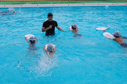 本日の水泳指導(泳ごう会)に東陽中学校の体育科の先生が講師として子ども達の指導に来てくださいました。
