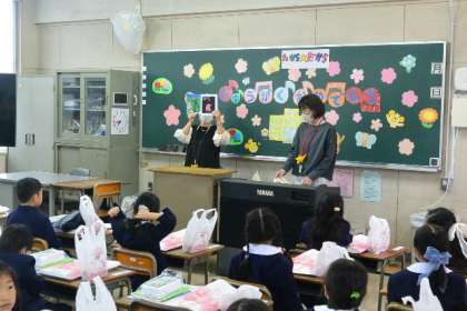 恒例になりました入学式のたからだからの読み聞かせ。1年生のみんなも「たからだから」という名前を覚えたみたいです。楽しく絵本の世界に入っていた1年生でした