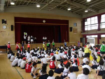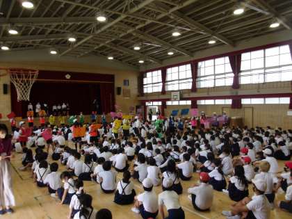 体育館に、全校児童が集まるのは久しぶりのことなのですが、6年生のリーダー達が低学年の児童を上手に誘導して列に並べていました。