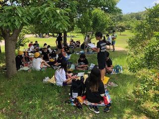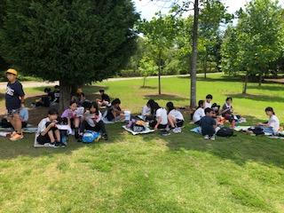 芝生の広場でお弁当です。気持ちいい風が吹いています。