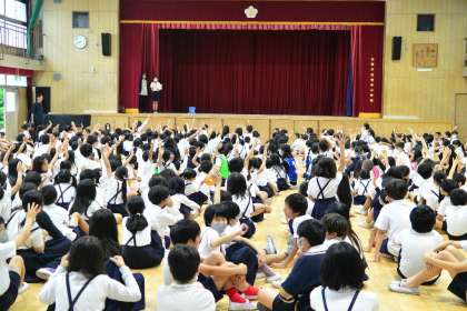 今日は雨なので体育館で児童集会をしました。「何が通ったでしょう?」というクイズです。何か物をもった児童が舞台を歩きます。何を持っているかをみんなで考えます。ふれあい班で答えます。