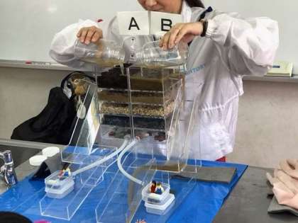 腐葉土と土の違いがわかるような地層モデルに濁った水(雨水)を流してみると、腐葉土の地層から流れた水は、少し時間をかけて透明な水になって落ちてきました。