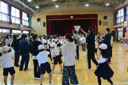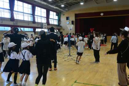 運動会で子どもたちは取り組んだダンシング玉入れを親子でやりました。たくさんの保護者の皆さんに来ていただきました。講堂で元気いっぱい玉入れを楽しみました。