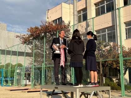 宝栄小子ども会からは、15名ほどの児童か参加し見事に優勝しました。児童朝会で代表児童に優勝カップが渡されました。おめでとう。