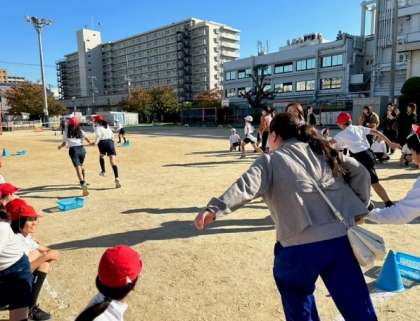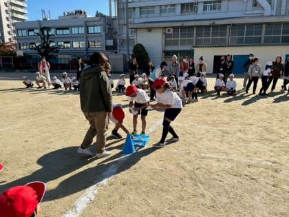 始めにお題に向かってダッシュ。そして、「スイミングのできる人」「ピアノが弾ける人」など書かれたお題カードを見せて、お題にあった人とペアを組んでゴールしました。友だちとペアになったり、友だちのお母さんとペアになったり白熱したゲームになりました。