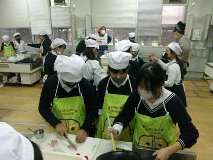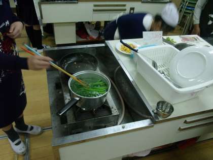 決められた材料を使って、各グループでお弁当に入れるおかずのレシピを考えて、作りました。