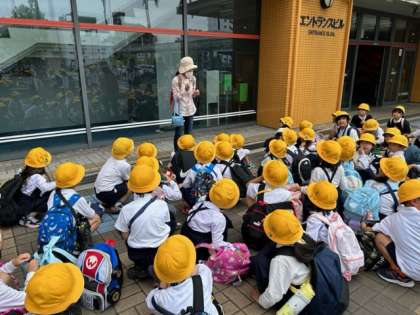 これから館内に入ります。今日はたくさんの学校から遠足に来ていますので、迷子にならないようにお話を聞いています。
