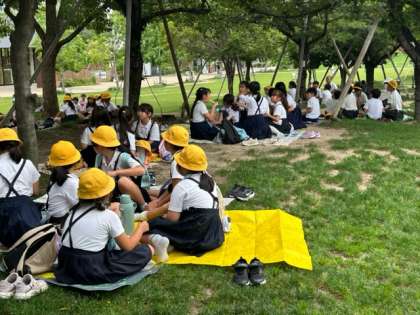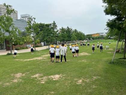 ?天王寺公園でお弁当を食べ、芝生の広場で遊びました。公園からハルカスを眺めると高いところにいたんだなあと実感できます。