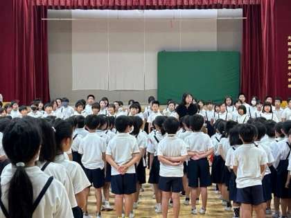 音楽集会を行いました。「あの青い空のように」を各学年でパートを分けて歌声を合わせました。最初は6年生の上手な合唱を聞き、5年生、4年生・・と順に歌いました。自然と拍手が起こり良い雰囲気でした。また、下の学年の子どもたちはいい刺激になりました。6年生の真似をしてきれいな歌声で歌っていました。最後に4年生が「すてきな友だち」を歌ってくれました。(感動して)涙が出そうになったと話してくれた1年生もいました。