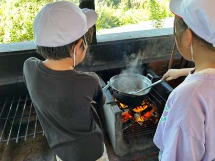 役割分担で進めています。野菜は少し小さく切り、かまどの火は消えないように薪を入れています。初めて体験した子からは「いい経験やわ」との声が。美味しいカレーライスができるでしょうか。