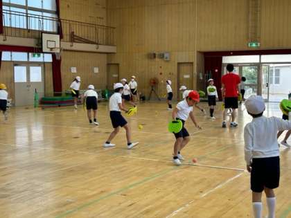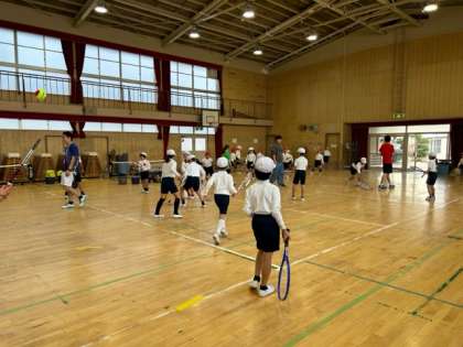 関西テニス協会、ノアテニススクールより、テニピン、テニスを教えて頂きました。3年生は2年間、テニピンを体験しているだけあり、上手にボールを打っていました。ラケットは初めて持った子もいましたが、テニピンの要領で慣れていくのが早かったです。時間いっぱい体をたくさん動かしました。