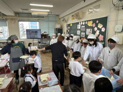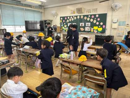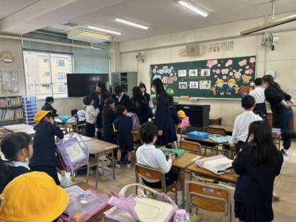 6年生は朝の用意、給食の配膳、清掃など、様々な場面で1年生と関わります。優しいお兄さん、お姉さんに1年生も安心しています。