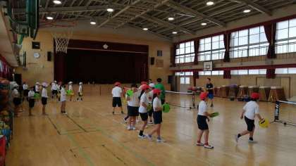 関西テニス協会、ノアテニススクールより、テニピン、テニスを教えていただきました。時間が経つにつれて、ラリーが続くようになっていました。子どもたちは夢中になって楽しそうに取り組んでいました。