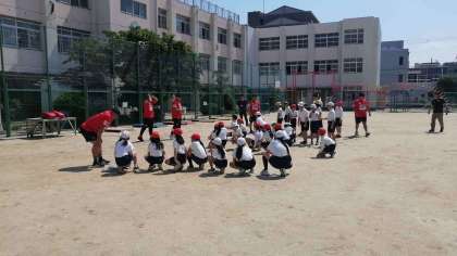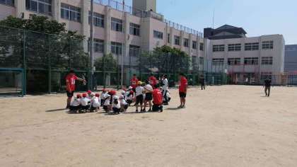 チームに分かれて、パス回しをしたり、選手にタックルをしたりアドバイスをいただきながら、貴重な体験をすることができました。子どもたちも元気に活動をしていました。