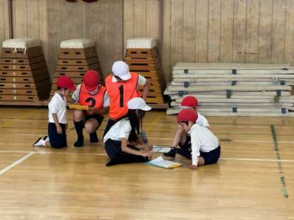 1年生が50m走、ソフトボール投げ、立ち幅跳びの測定を行いました。初めて体験することなので、ペアの6年生に教えてもらいました。優しい声かけに、安心して力一杯取り組んでいました。