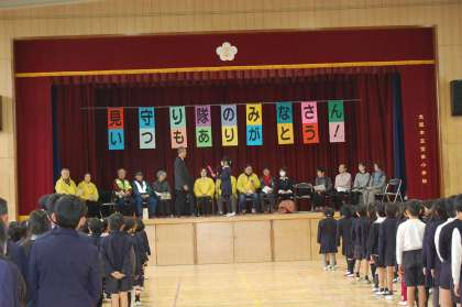 本日5時間目に講堂で、見守り隊との交流会を行いました。子ども達が毎日元気に登校できるのも、見守り隊の皆さんが日々子ども達が安全に登校できるように見届けてくださっているおかげです。その感謝の気持ちを込めて、一緒にじゃんけんゲームをしたり、歌を歌ったりして楽しいひと時を過ごしました。