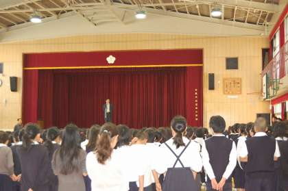 本日宝栄小学校は、64回目の創立記念日を迎えました。その記念を祝して、講堂で校歌を歌いました。
