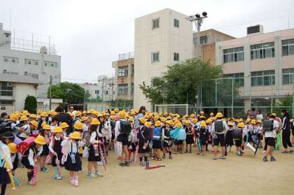 6年生が1年生を迎えに行き、全学年が班ごとに集合しました。班で力を合わせて並んでいました。