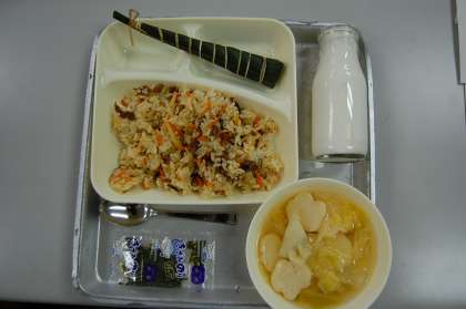 連休明けの今日、子どもたちは元気に登校してきてくれました。久しぶりの学校の授業を頑張ってこなし、さあ、給食の時間となると、いつも以上に喜んでいるように感じました。今日の給食は、子どもの日の行事献立でした。メニューは、「牛肉のちらしずし、すまし汁、ちまき」です。ちまきは甘くておいしいと、甘いものが好きな子どもたちは好評でした!