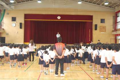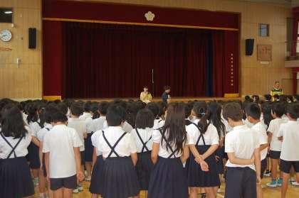 今日の朝礼では、今週土曜日に行われます「見守り隊との交流会」に向けて、2回目の練習がありました。よびかけ練習を中心に行われ、特に、全校児童で「ありがとうございました。」と御礼の言葉をいうところでは、声をそろえて、気持ちをこめていえるよう念入りに繰り返し練習をしました。