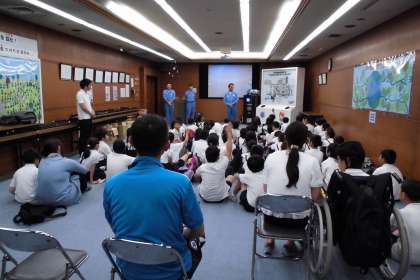 ゴミピット、集まってきたゴミを巨大なクレーンつかんで、焼却炉に入れるところでは、子どもたちはとても驚いていました。他にも灰ピット、燃え残って冷えた灰をクレーンでトラックに積み込むところを見学しました。最後の質問の時間では、一つ一つの工場内の物の大きさやごみの量などに驚いていました。