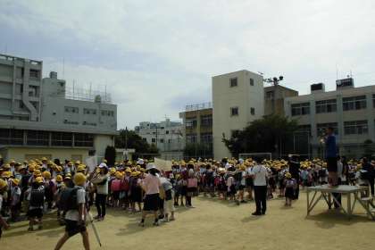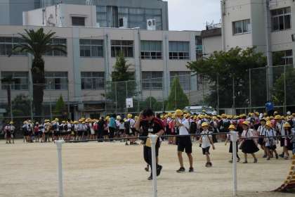 今日は集団下校おこないました。全学年が集団下校の班ごとに運動場へ集合しました。児童は班で力を合わせて並んでいました。班ごとに並んで集団下校しました。
