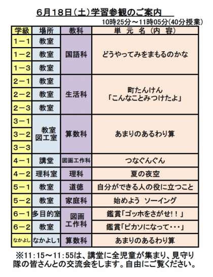 明日は土曜授業と参観があります。また4時間目には見守り隊との交流会も予定しております。たくさんの参観をお待ちしております。