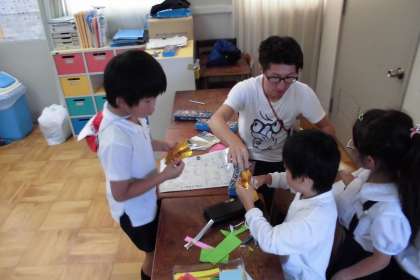 折り紙とはさみをつかって、器用にかざりつけを作っていました。