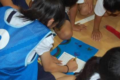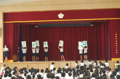 今日の児童集会では、言葉の並び替えクイズをしました。ばらばらに並んだ文字を正しく並び替えて言葉をつくるのですが、どんな言葉になるのか、1年生から6年生まで頭を悩ませながら考えました。ふれあい班で協力して活動することができました。