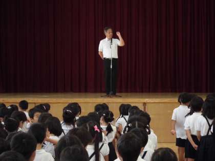 1学期ありがとうございました。大きな事件事故もなくつつがなく本日終業式を迎えることができます。これもひとえに保護者・地域の方々のご協力とご支援のおかげです。特に毎朝子どもたちの安全な登校を見守っていただきました地域見守り隊の方々には厚くお礼を申しあげます。子どもたちは明日から長い夏休みに入ります。ご迷惑をおかけすることもあるとは存じますがご指導よろしくお願いいたします。2学期の始業式は8月27日(土)です。当日はふれあい清掃を行います。子どもたちと保護者・地域の方々で学校を美しくしたいと考えます。よろしくお願いします。