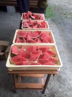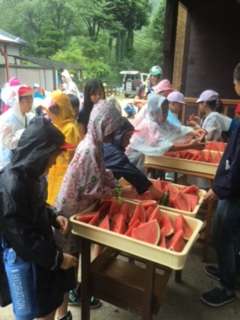 食事のあとは、おまちかねのデザートタイム。今日はスイカです。外で食べるスイカは格別です。食べすぎには気をつけましょう!
