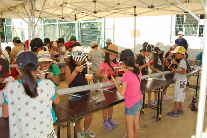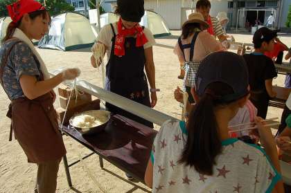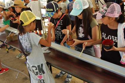 今日の朝食は、流しそうめんです。暑い日にはもってこいのメニューです。子どもたちは流れてくるそうめんをとって、おいしそうに食べています。