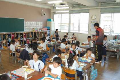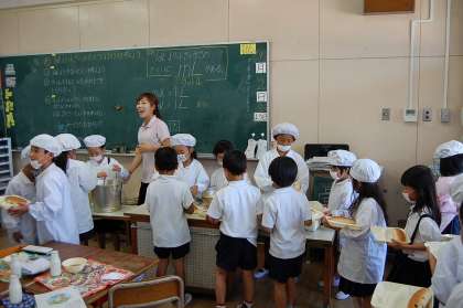 今日から給食が始まりました。子どもたちは久しぶりの給食をおいしく食べていました。