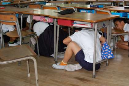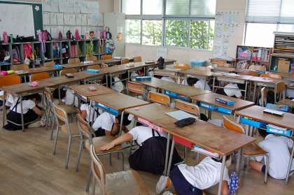 今日は「大阪880万人訓練」がありました。本校でも、校長先生の話を聞いた後、スピーカーからの訓練を始めるお知らせを聞き、地震から身を守る練習をしました。子どもたちは机の下にもぐって、机が動かないようにしっかり手でもって固定し、頭を机の下にかくすように体を丸めて静かに指示を待っていました。
