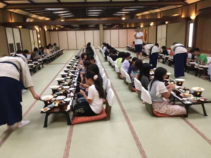お風呂でさっぱりした後は、楽しみにしている夕食の時間です。たくさんの食べ物の前に子どもたちは興奮しています。しっかり食べて、明日も元気に活動しましょう!