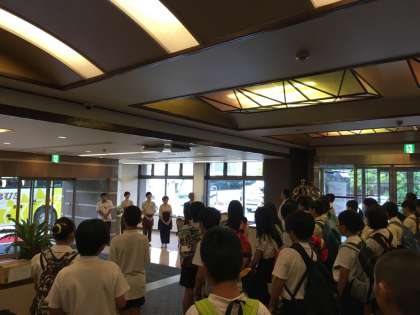 お世話になった海月館とお別れです。閉舎式では感謝の気持ちを伝えることができました。このあとはチャレンジファームに移動し、体験活動です。