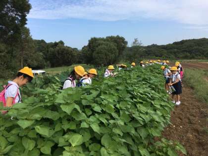 チャレンジファームに到着しました。天候にも恵まれ、みんな熱心に「えごま」の収穫をしています。