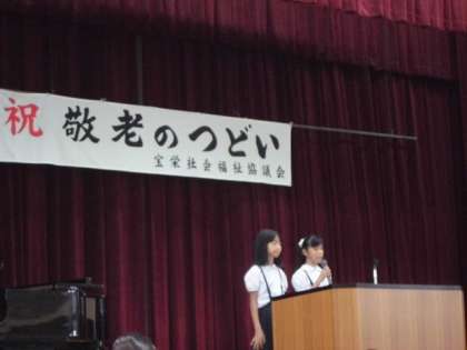 本日敬老のつどいが行われました。児童会代表として6年生の児童2人と4年生が敬老のつどいに参加しました。緊張していましたが、宝栄小学校の代表として活躍してくれました。