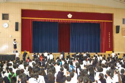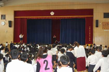 今日の児童集会では、舞台の幕と幕の間を通ったものを、ふれあい班で考えるというクイズが行われました。予想だにしない意外なものが通り、子どもたちからは大きな笑いが起き、大盛り上がりでした。