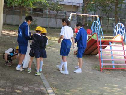 宝栄小学校1・2年生と東陽中学校1年生が清掃活動を通して仲よくなりました