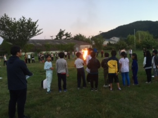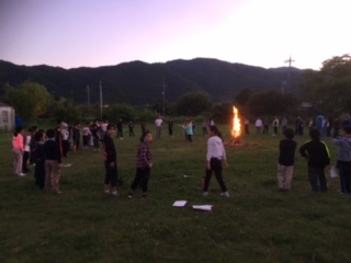 まだまだ明るいですが、キャンプファイヤーです。係の人がゲーム、クイズを出して盛り上げてくれています。