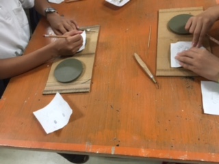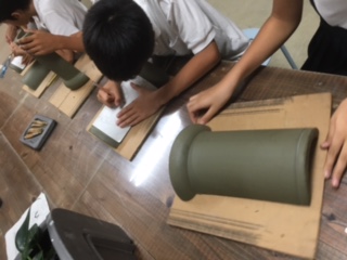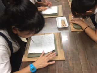 瓦作り体験です。土を触ることが大切だと工場のかたのお話が印象てきでした。