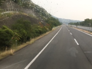 瓦作り体験を終えて、ホテルに向かいます。バスに乗ったら雨でした。